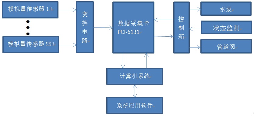 本系統(tǒng)由多路傳感器(10路水勢(shì)、6路溫度傳感器、4路鹽分傳感器,降水量、蒸發(fā)量、壓力、水位傳感器各2路)、管道閥門、水泵、計(jì)算機(jī)系統(tǒng)、數(shù)據(jù)采集卡(SFPCI-6131)及狀態(tài)監(jiān)測(cè)等外部設(shè)備組成。