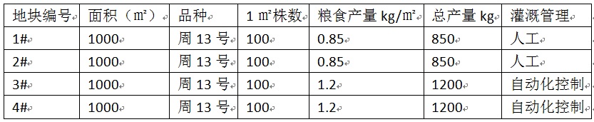 實(shí)際在麥田中的應(yīng)用,1#、2#地塊管理方式是人工管理,3#、4#地塊管理方式是自動(dòng)化控制管理。相同面積的地塊,人工管理田地和自動(dòng)化控制系統(tǒng)管理田地下,糧食產(chǎn)量的對(duì)比。在采用了計(jì)算機(jī)控制下的自動(dòng)灌溉,灌水量、灌水時(shí)間完全可以根據(jù)小麥的土壤條件、生長(zhǎng)階段等指標(biāo)合理計(jì)算控制,使得自動(dòng)化控制管理的地塊在同等氣候、施肥條件下產(chǎn)量遠(yuǎn)高于人工管理的地塊。產(chǎn)量表格如下。