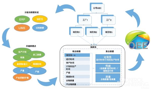 举例说明,当从例如填充这个生产工艺中采集数据时,在企业范围内可能有几种不同的填充剂类型,而用户可能想要针对每一种填充剂计算设备综合效率(OEE)。尽管不同的填充剂可能有不同的输入和输出,它们还是有一些相同的属性。定义好了一种填充剂之后,用户会想要了解填充容积、被填充的容器数量、以及停产时间。用户也可能想要计算出计划的生产时间,这会需要生产计划和人员的可用性。实验室或质量数据可以帮助计算不合格的产品或废料。